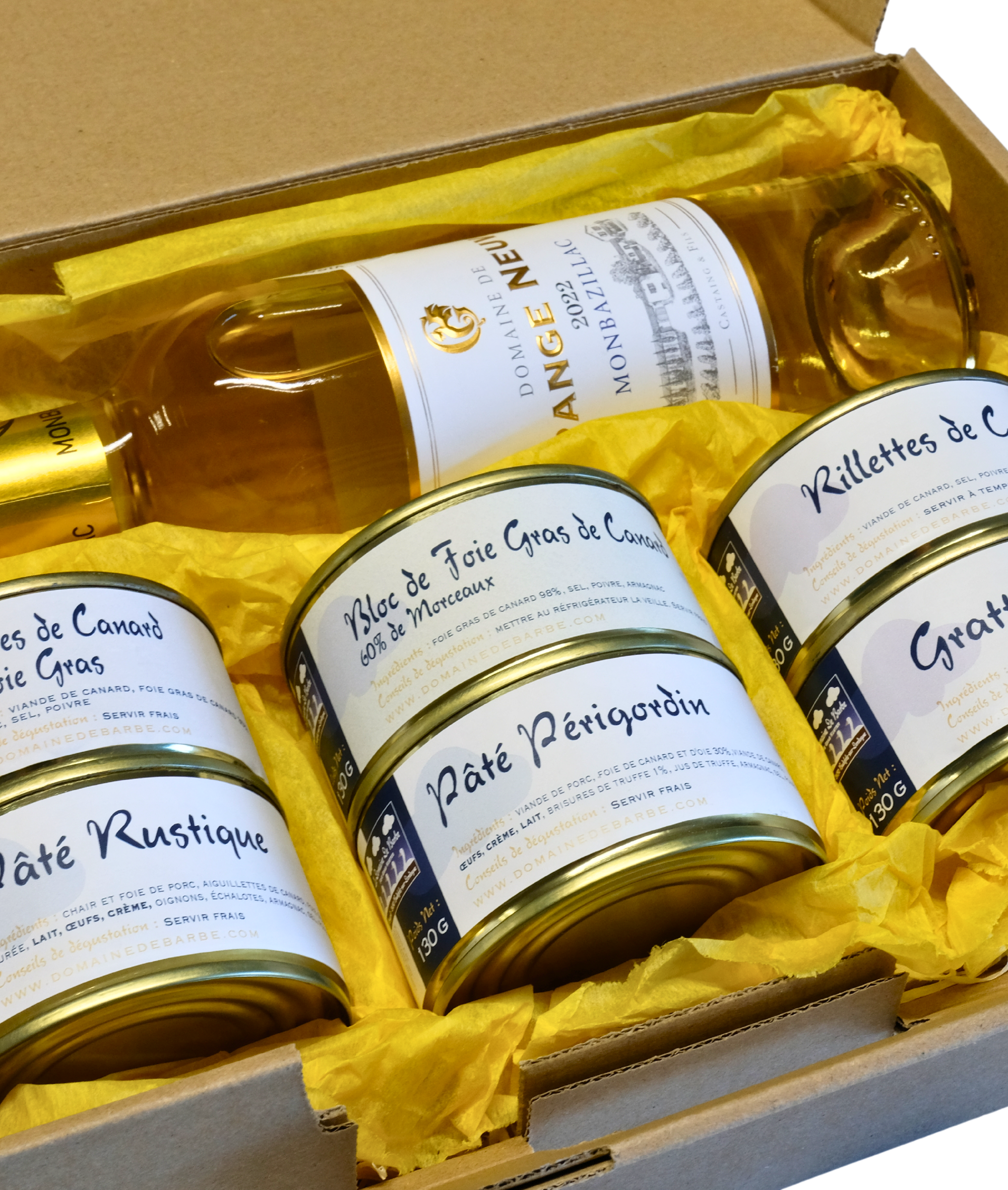 1 grattons 130g, 1 pâté rustique 130g, 1 rillettes de canard 130g, 1 rillettes au foie gras 130g, 1 pâté Périgordin 130g, 1 bloc de foie gras de canard (60% de morceaux) 130g, 1 Monbazillac 37.5cl