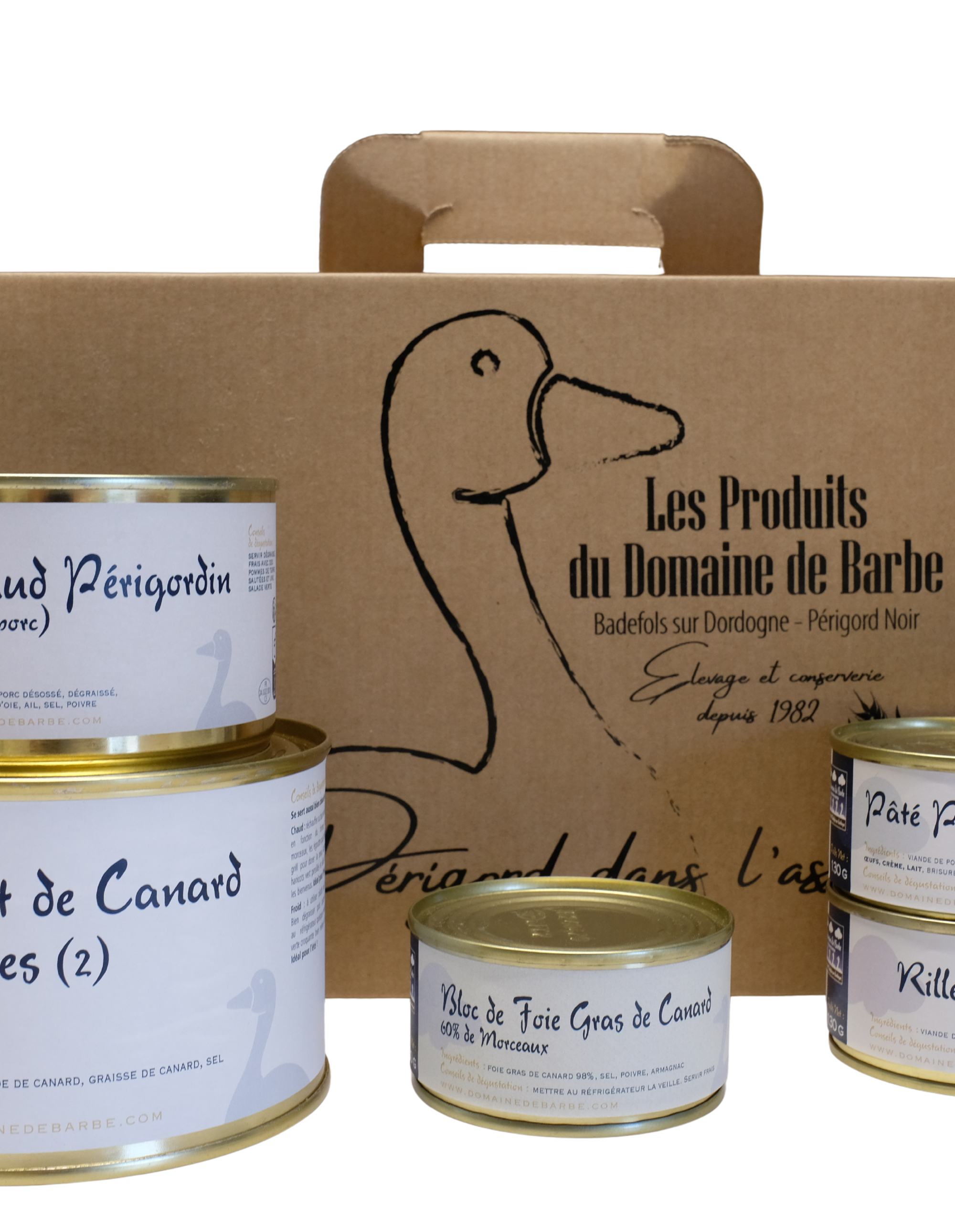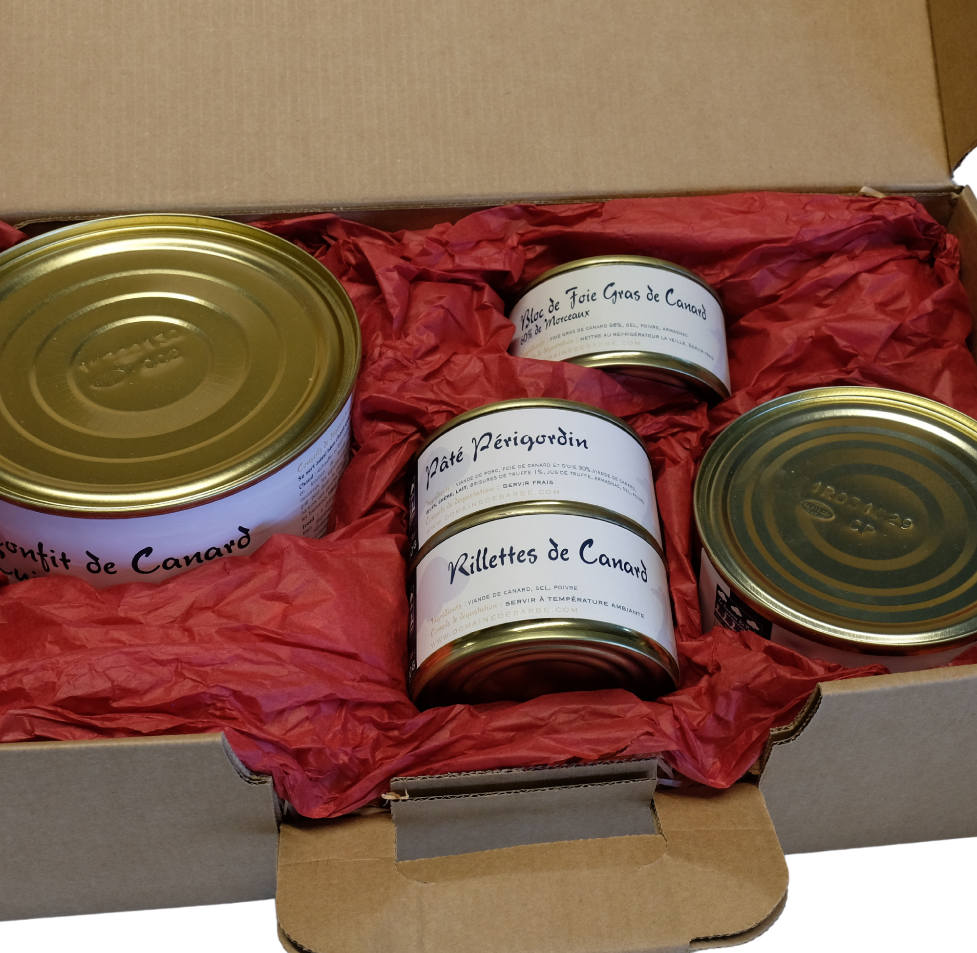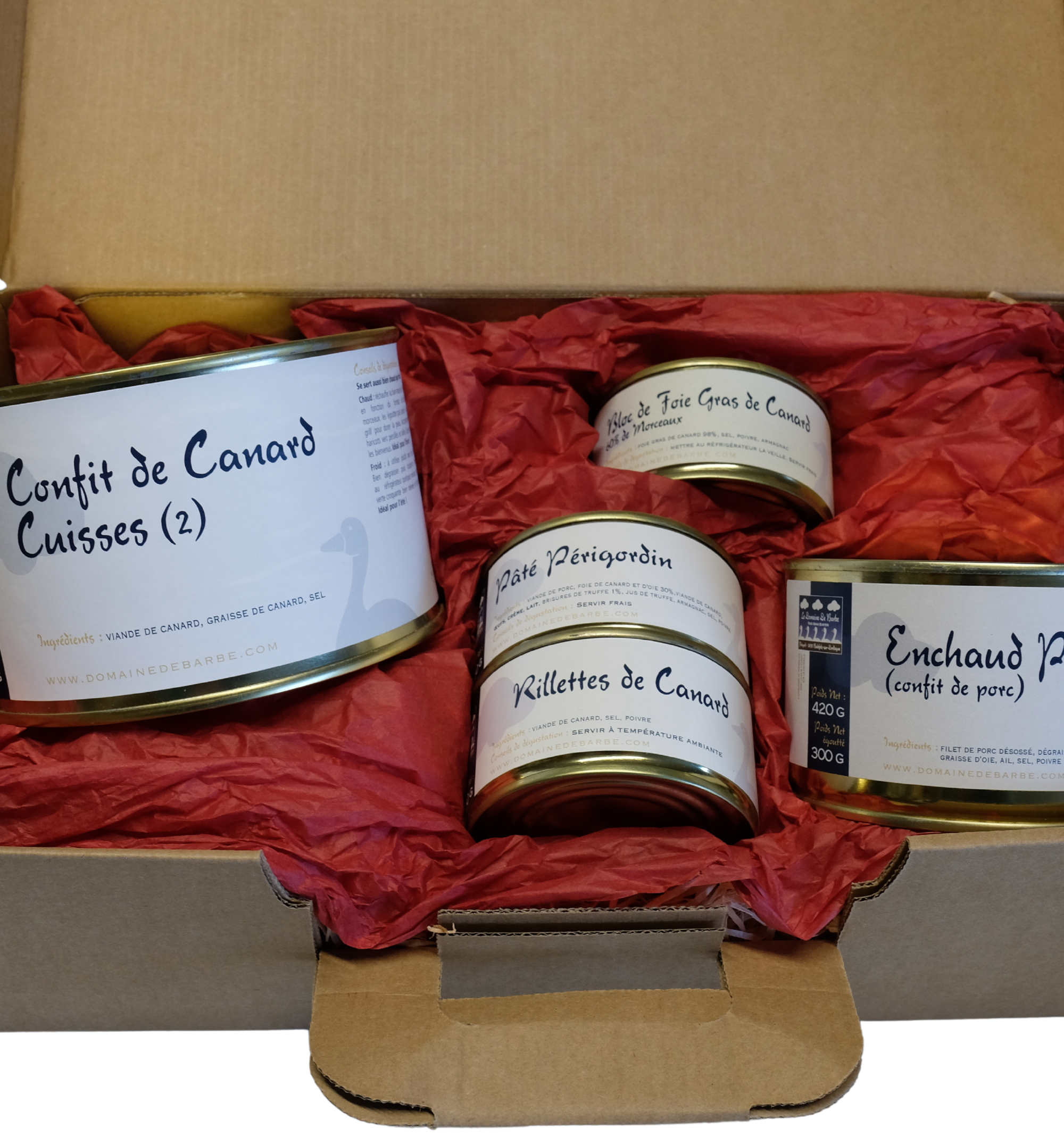 1 bloc de foie gras de canard 130g (60% de morceaux), 1 pâté Périgordin 130g, 1 rillettes de canard 130g, 1 Confit de canard 350g (2 cuisses), 1 enchaud Périgordin 300g