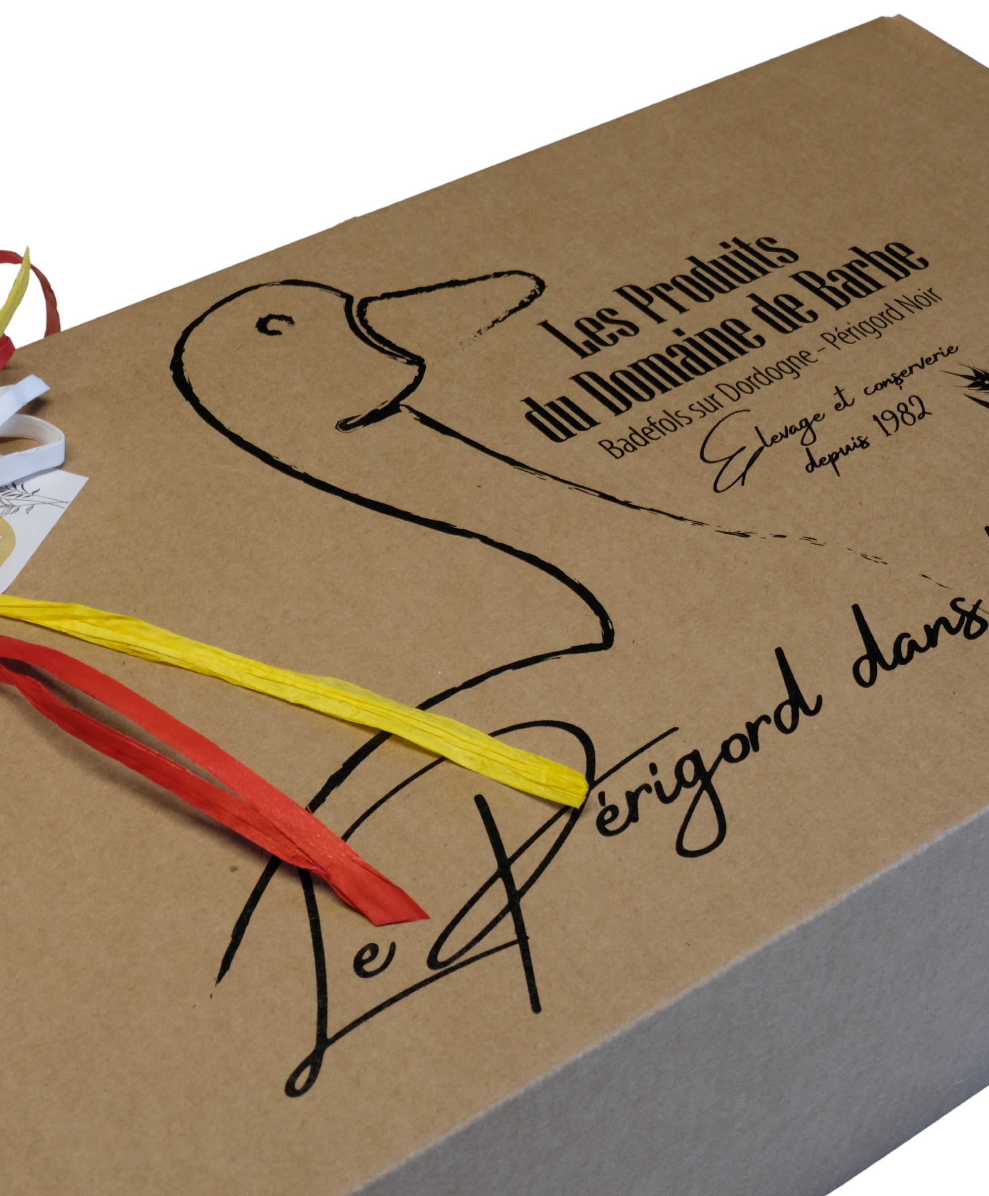 Valisette en carton sérigraphié comprenant des conserves et vin du Périgord.