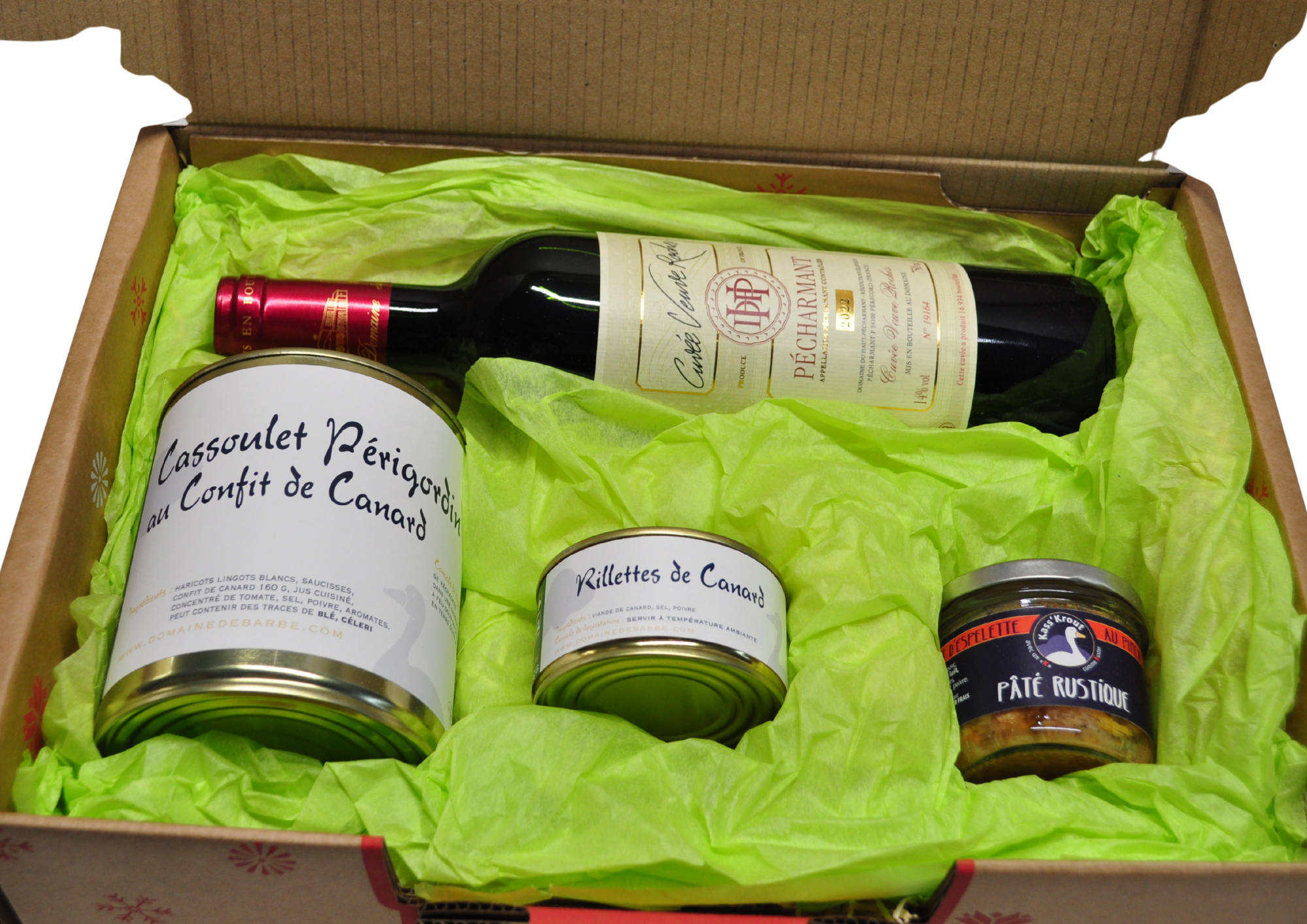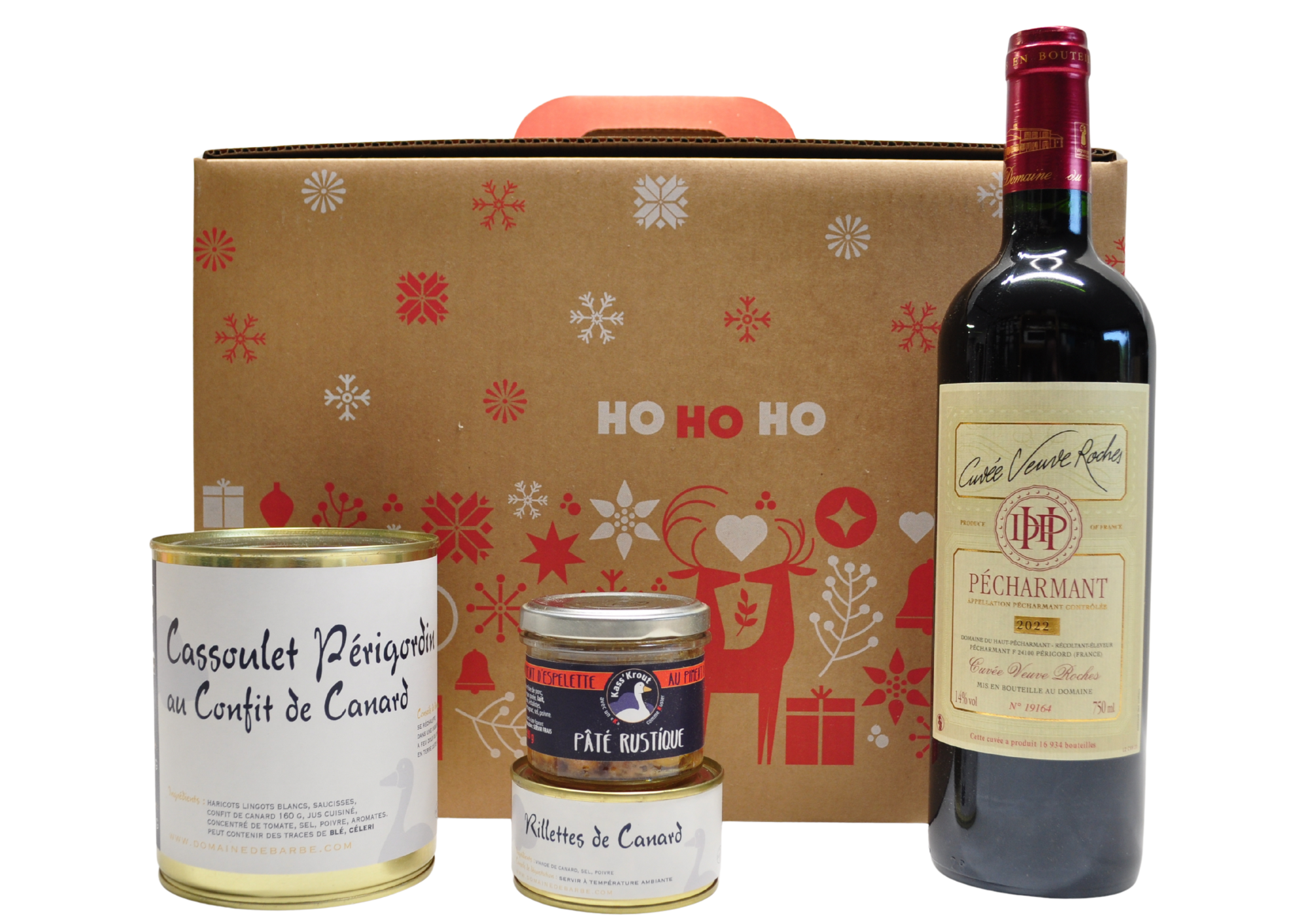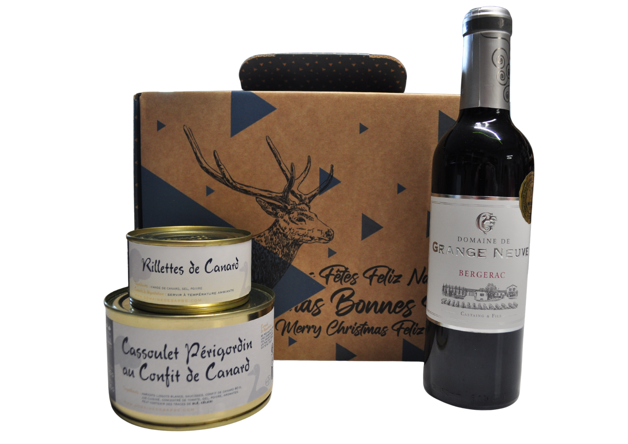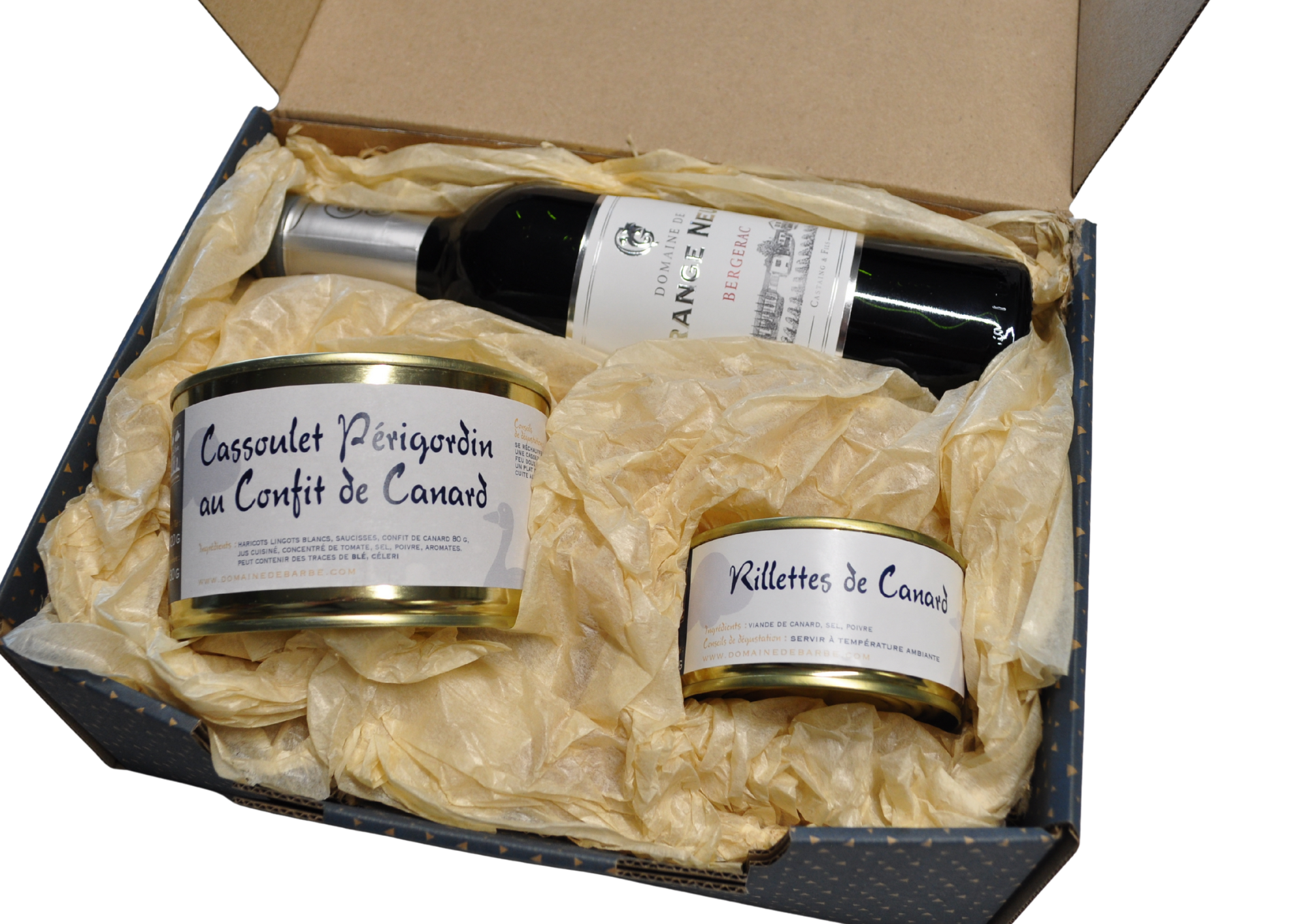 1 x Pécharmant 75cl, 1 x cassoulet 820g, 1 x rillettes de canard 130g, 1 x pâté rustique à l’Espelette 90g