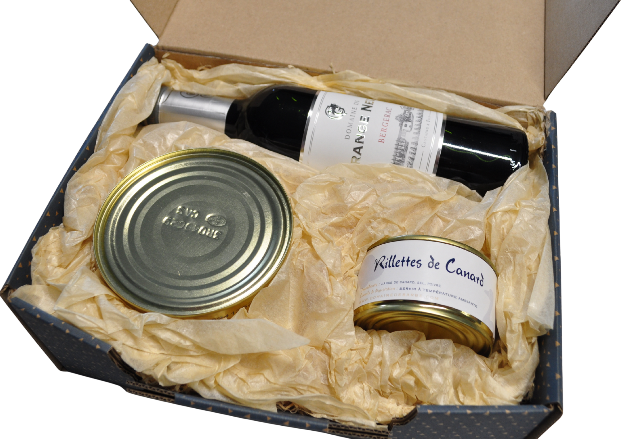 1 x Bloc de foie gras de canard avec morceaux 130g, 1 x rillettes de canard 130g, 1 x grattons 130g, 1 x confit de canard 350g (2 cuisses), 1 x bouteille de Monbazillac 75cl