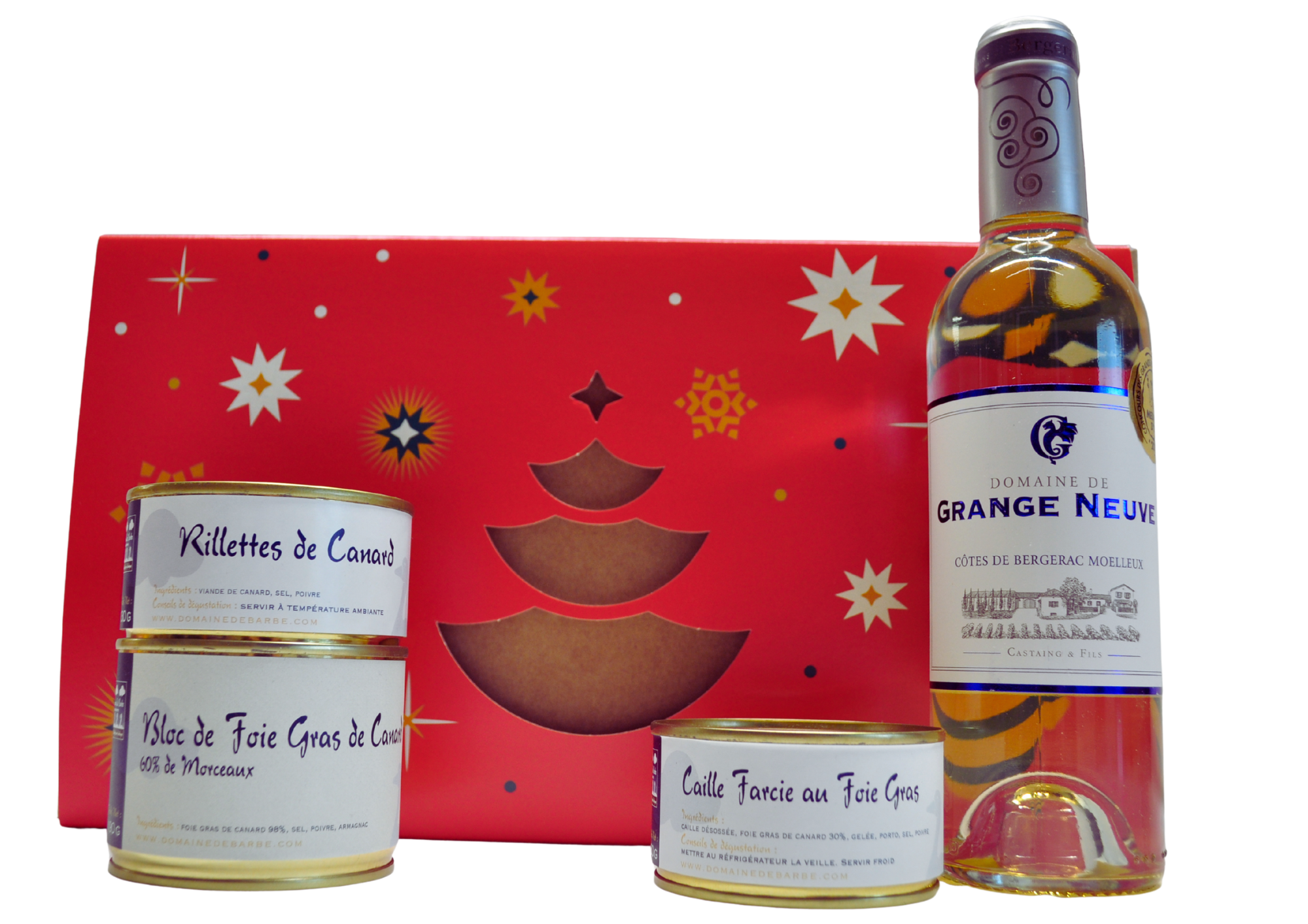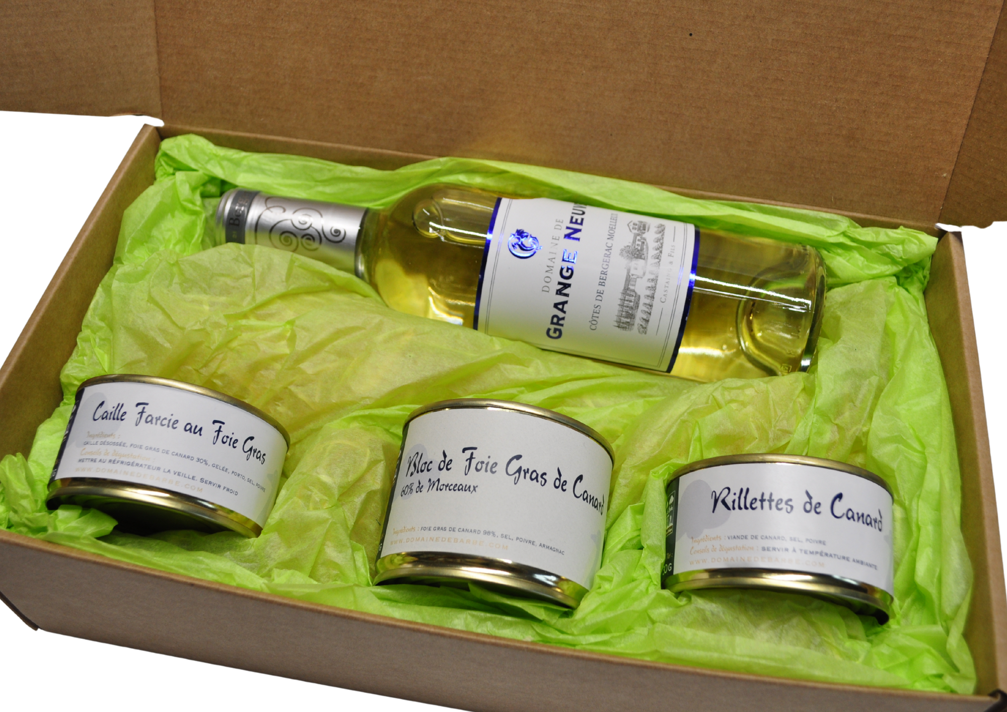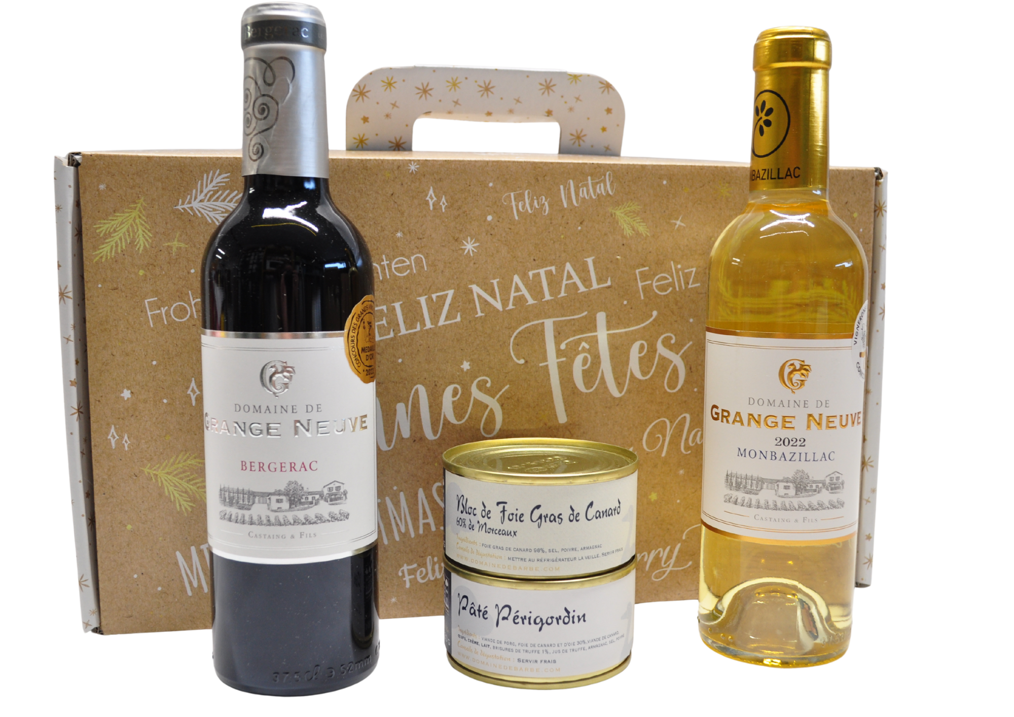 1 x bloc de foie gras de canard (avec morceaux) 130g, 1 x pâté périgordin 130g, 1 x Monbazillac 37.5cl, 1 x côte de Bergerac 37.5cl