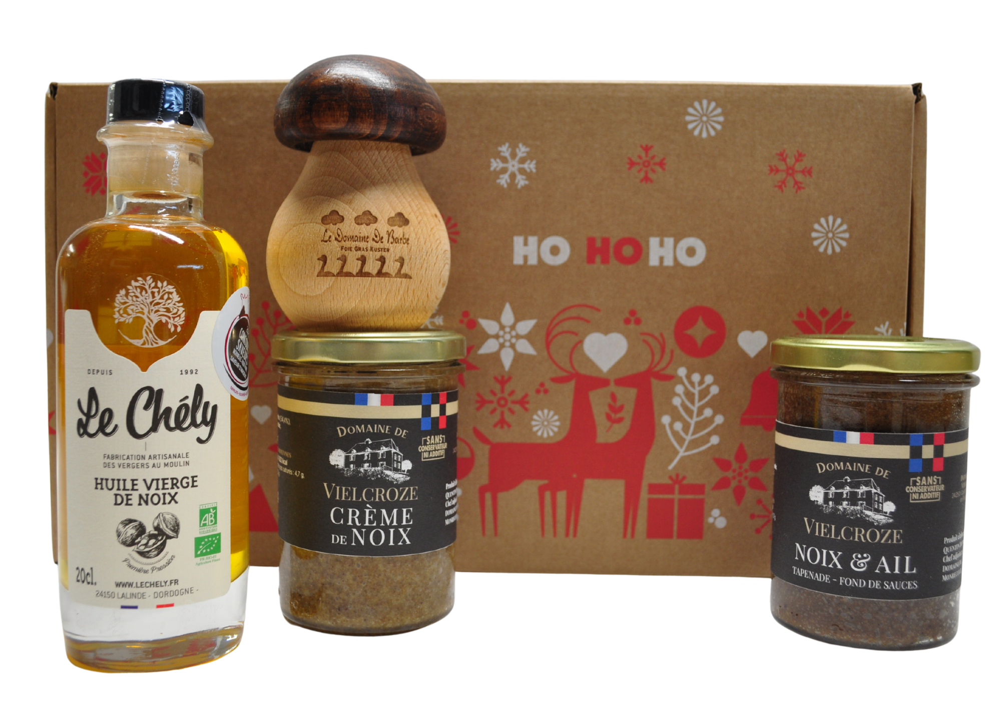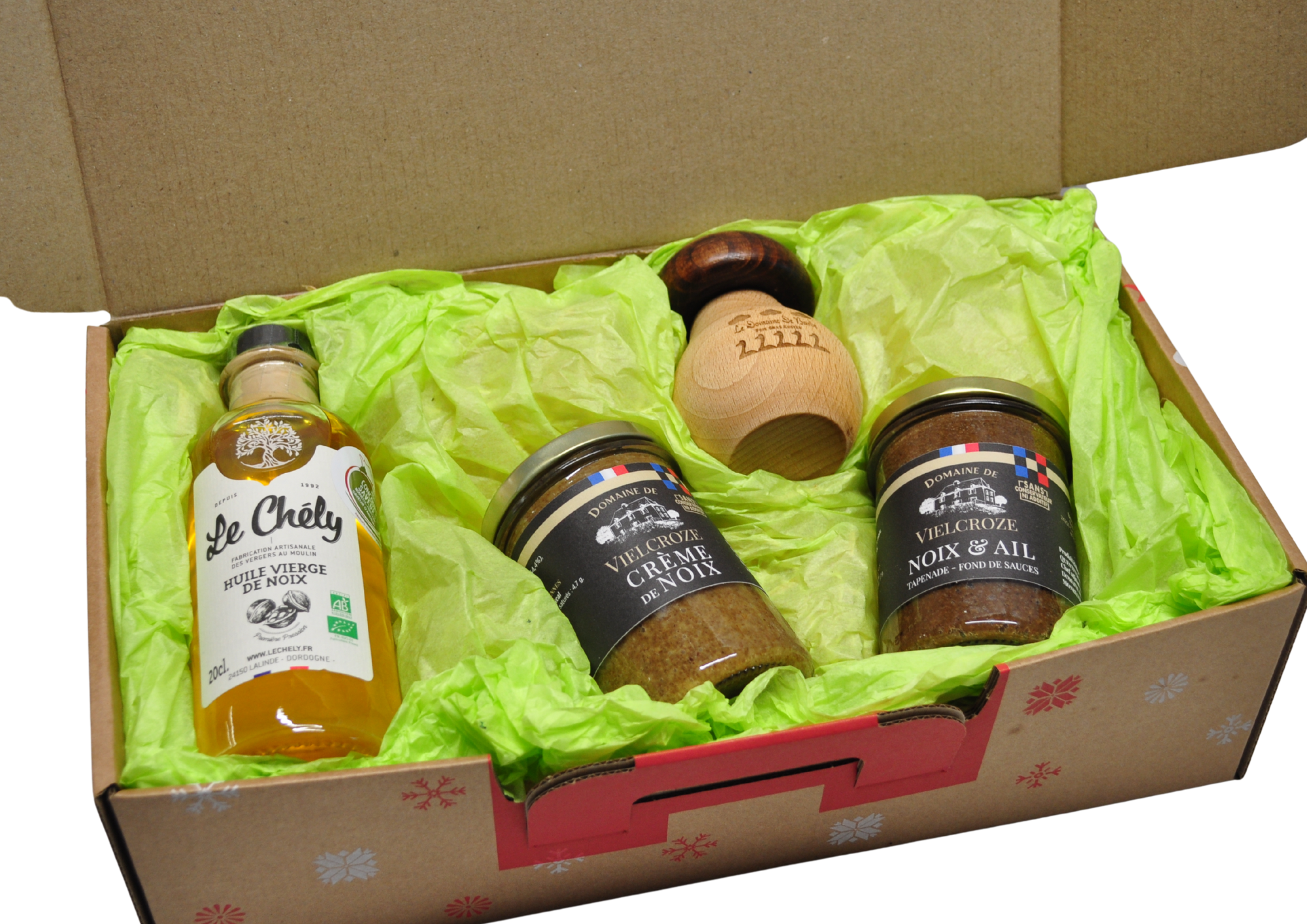 1 x huile vierge de noix 20cl, 1 crème de noix 210g (sucré), 1 noix & ail 195g (salé), 1 casse-noix à l’effigie du Domaine