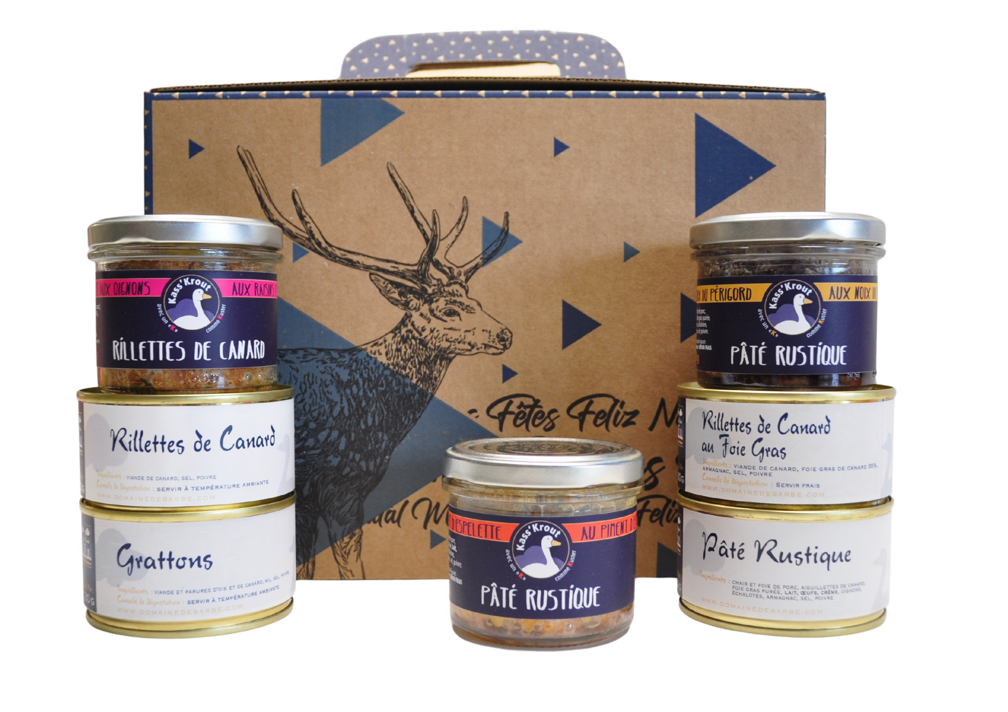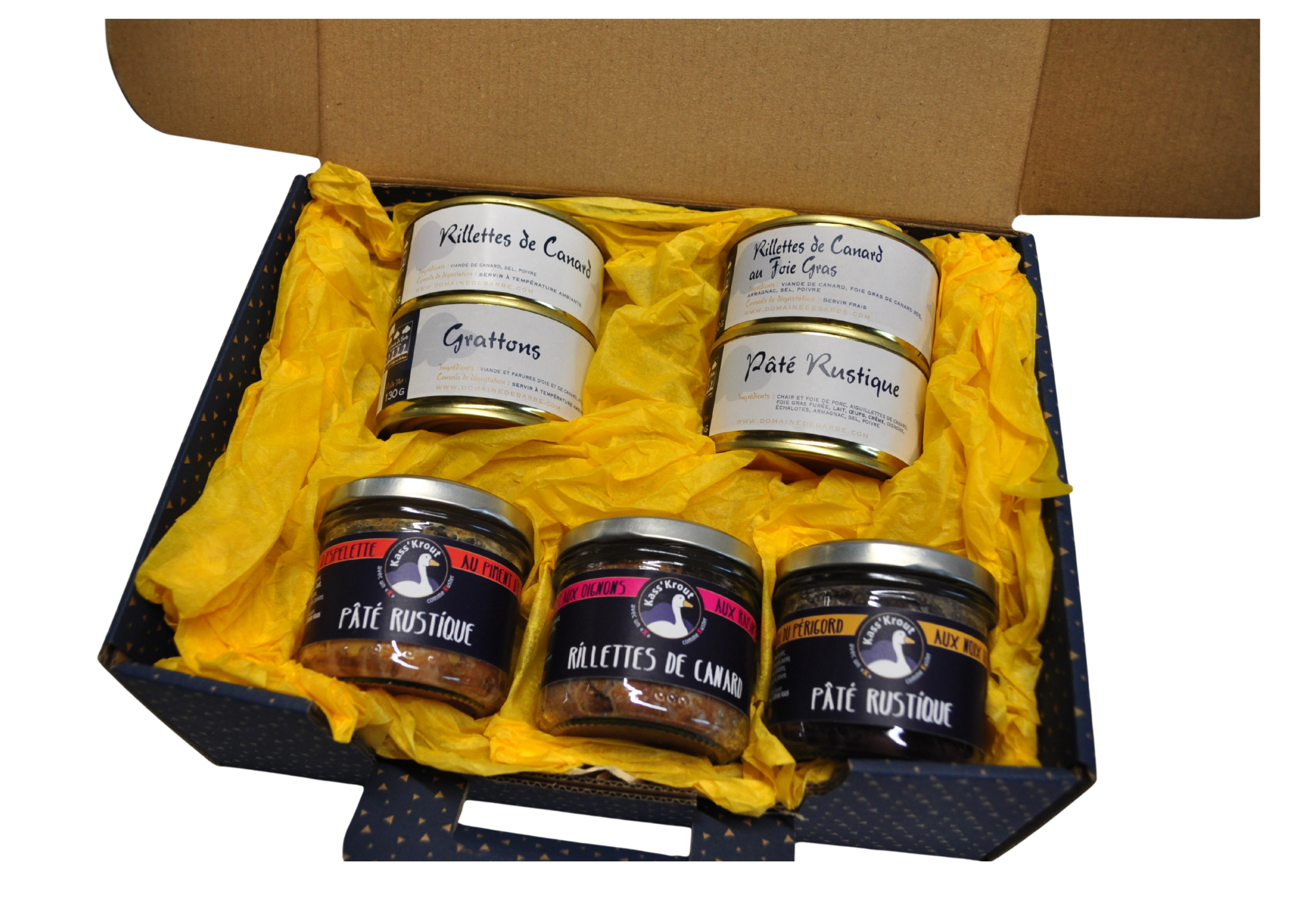 1 x rillettes de canard 130g, 1 x grattons 130g, 1 x rillettes au foie gras 130g, 1 x pâté rustique 130g, 1 x pâté Espelette 90g, 1 x rillettes oignons raisins 90g, 1 x pâté aux noix 90g